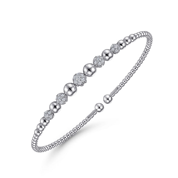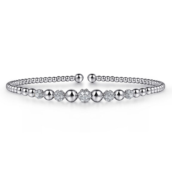 This Bujukan cuff bracelet features a soft circular motif. The sides of the open cuff design are crafted in smooth 14K white gold fashioned into delicate beads. Across the center, a series of round cut diamonds set in cool 14K white gold create a continuous stream of sparkle - 0.35cts in total