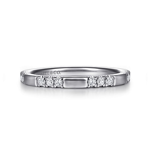 This 14K White Gold Diamond Wedding Band made by Gabriel & Co contains 12 round brilliant cut diamonds that weigh 0.17 carat and they average SI-2 in internal clarity and G-H in color.