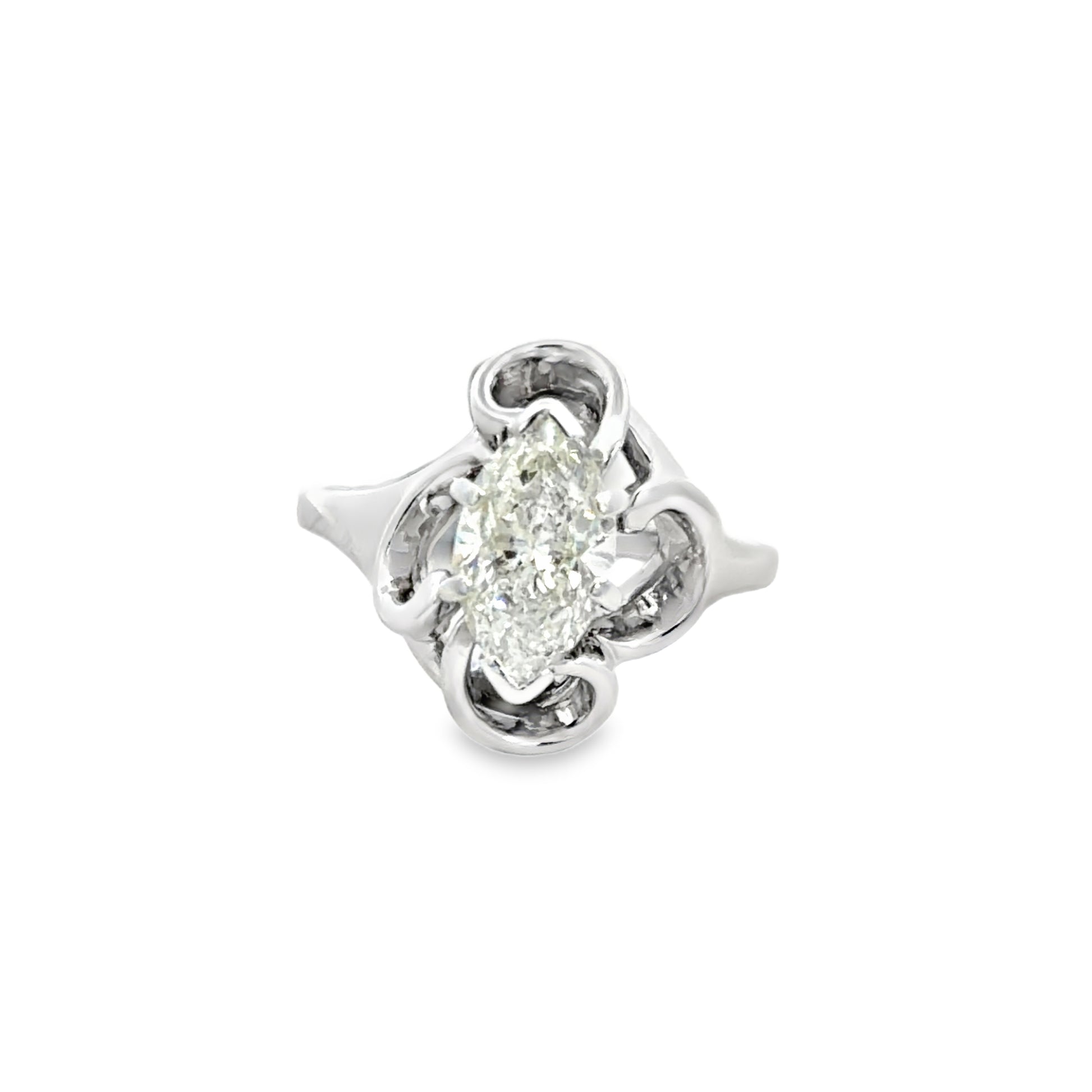 This pre-owned 14K White Gold Diamond Ring is the perfect addition to every antique lover's jewelry collection! This ring features a beautiful marquise diamond that has an approximate total diamond weight of 1.75cts, and K in color and I1 in internal clarity.