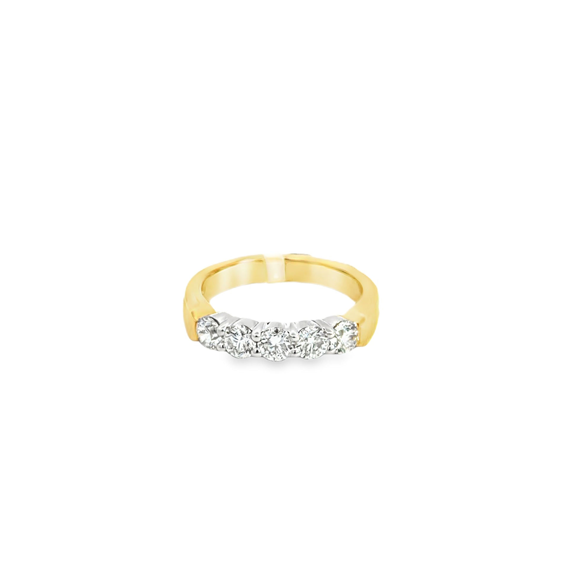 14K YELLOW AND WHITE GOLD DIAMOND BAND. THIS BAND FEATURES FIVE ROUND BRILLIANT CUT DIAMONDS WITH AN SI1 INTERNAL CLARITY , G COLOR, AND A TOTAL DIAMOND WEIGHT OF 0.96CT.