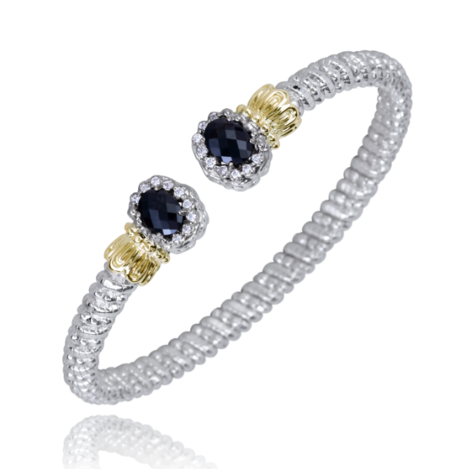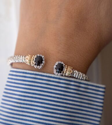 Black Onyx and diamonds blend beautifully on our open cuff stackable bracelet, designed with a Moiré Beaded® pattern. Crafted in 14K gold and sterling silver, it complements an array of other VAHAN bracelets—stack them together for a bold style statement.