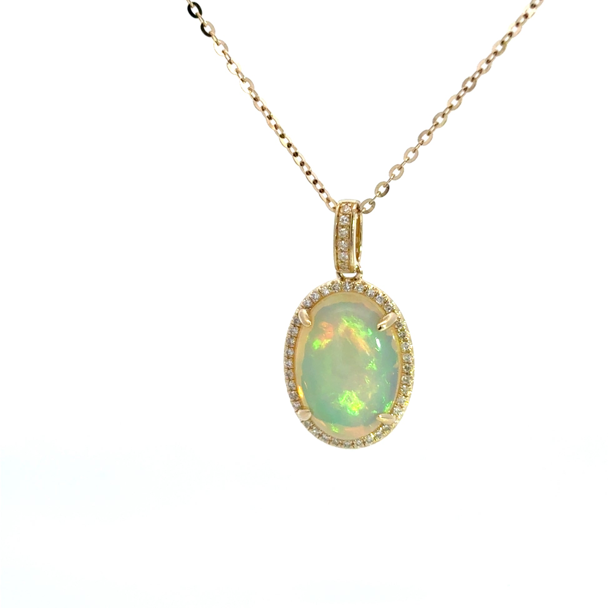 14K YELLOW GOLD DIAMOND AND OPAL NECKLACE, STYLE NUMBER IS N02612-OPAL.Y. THE NECKLACE CONTAINS 42 ROUND BRILLIANT CUT DIAMONDS WEIGHS 0.13 CARATS. SI-2 INTERNAL CLARITY, G IN COLOR. THE ONE OVAL OPAL WEIGHS 2.82 CARATS TW.