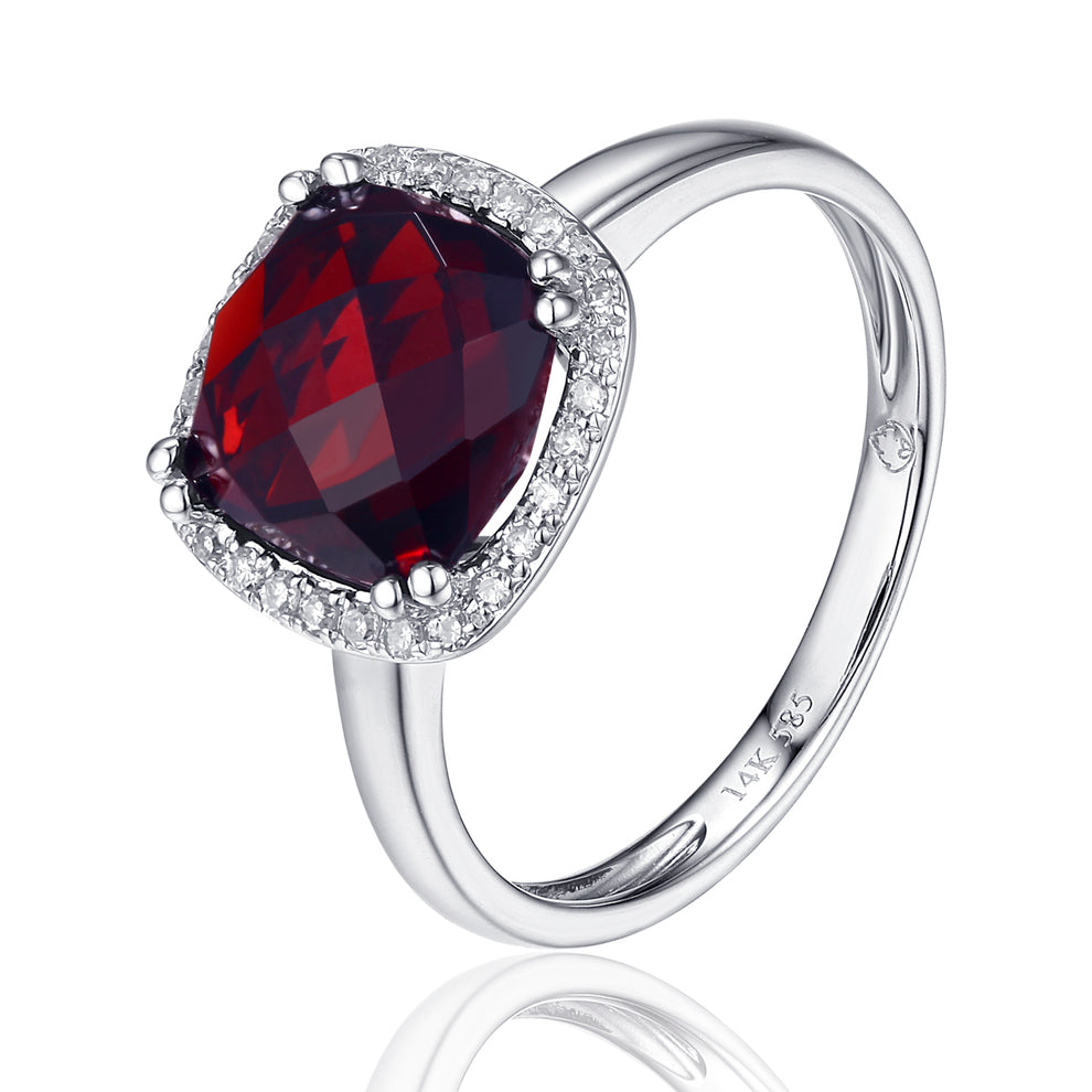 ONE 14K WHITE GOLD HALO CUSHION CUT GARNET AND DIAMOND RING WITH 28 NATURAL ROUND DIAMONDS WITH A TOTAL CARAT WEIGHT OF 0.10 CARATS SI2 INTERNAL CLARITY,0 G IN COLOR. AND 1 CUSHION CUT GARNET WITH A TOTAL CARAT WEIGHT OF 3.75 CARATS.