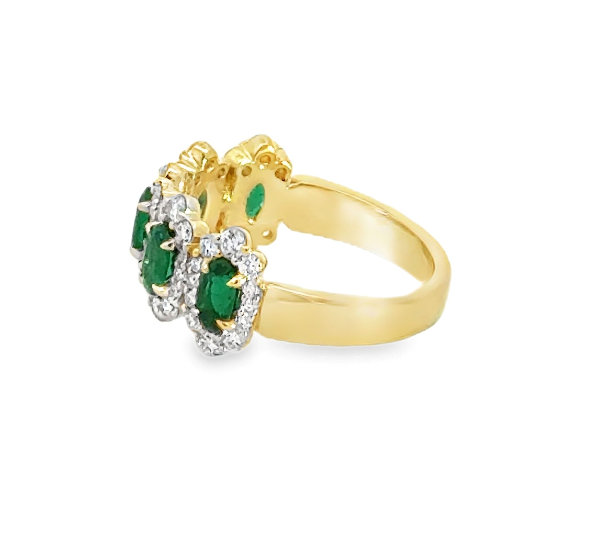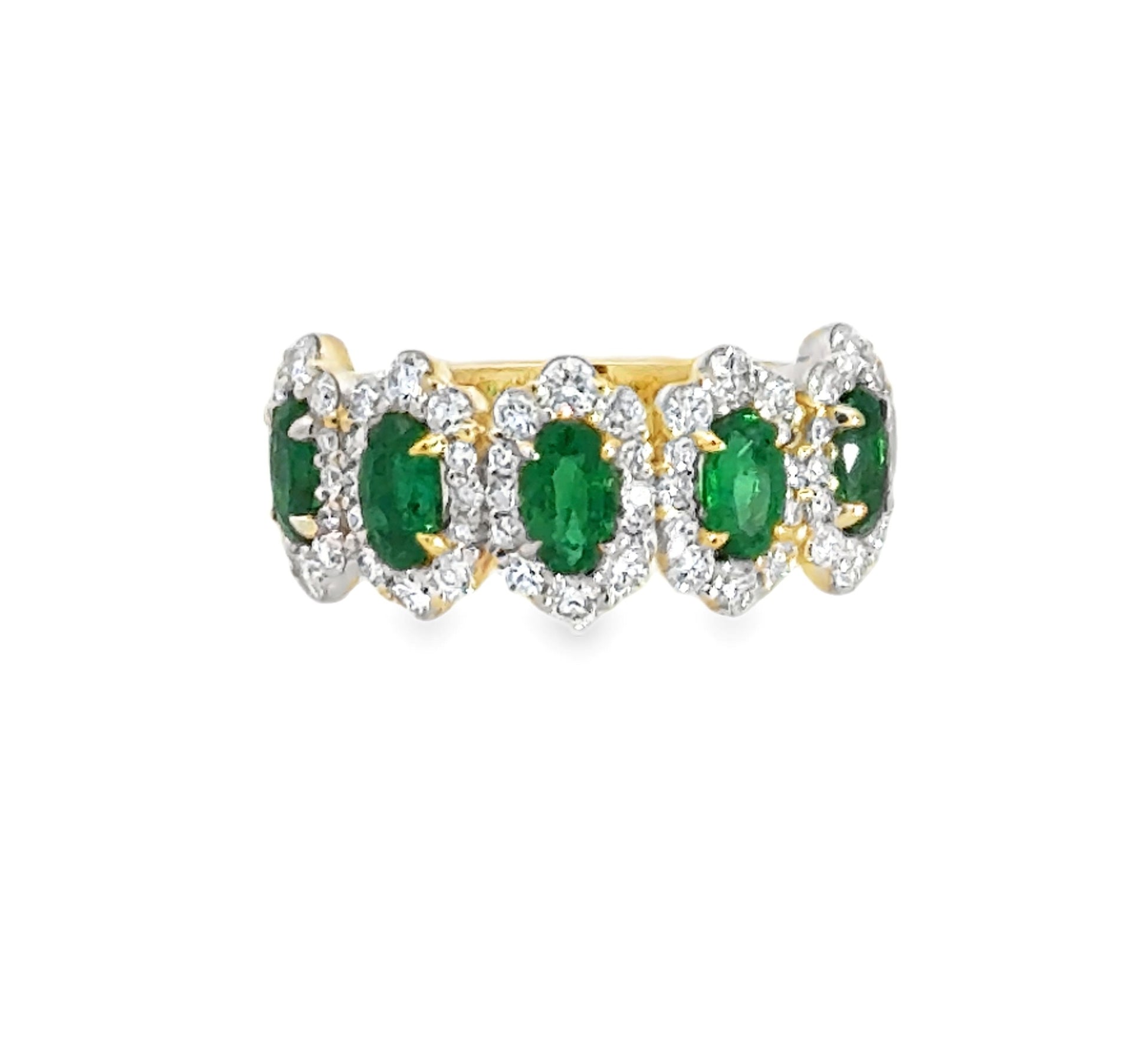 Vibrant and luxurious, this 14K yellow gold ring features a stunning combination of vivid emeralds and sparkling diamonds. The design showcases five oval-shaped emeralds totaling 1.12 carats, offering rich green hues that symbolize renewal and elegance. Surrounding the emeralds are 60 round brilliant diamonds with SI1 clarity and G color, adding a radiant 0.79 carats of dazzling sparkle. This exquisite piece blends timeless gemstones with fine craftsmanship, making it a striking choice for both special occasions and everyday sophistication.