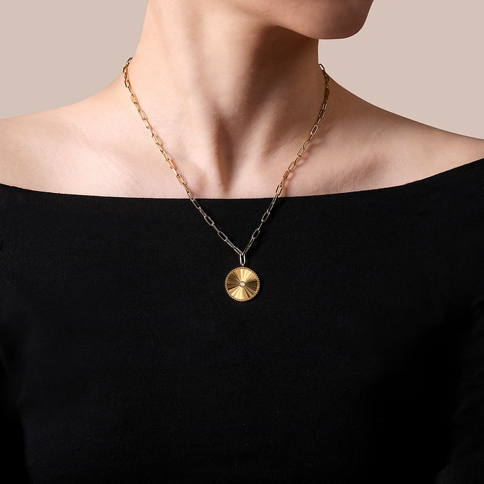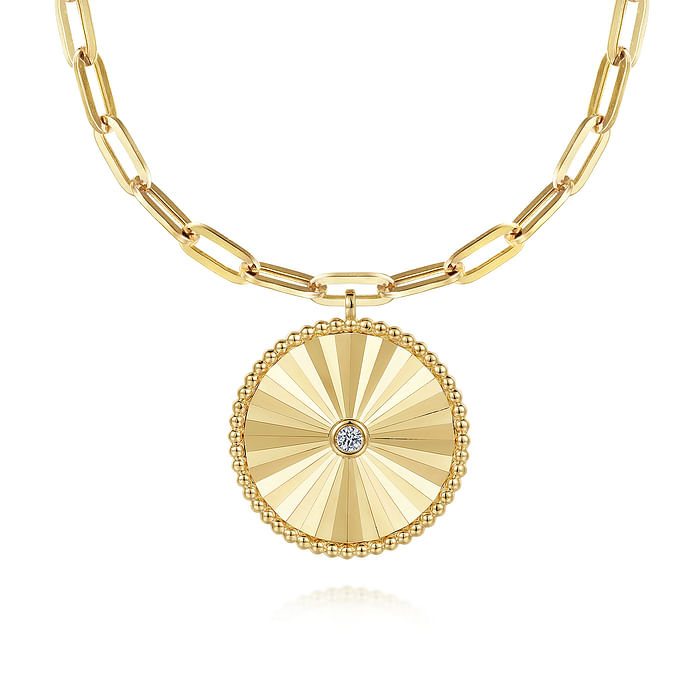 Dress up any look day or night with this sophisticated medallion necklace. A round pendant features a 0.05ct bezel set diamond surrounded by a faceted 14K yellow gold disc. Gleaming Bujukan beads frame the pendant which is suspended from a stylish paperclip chain.