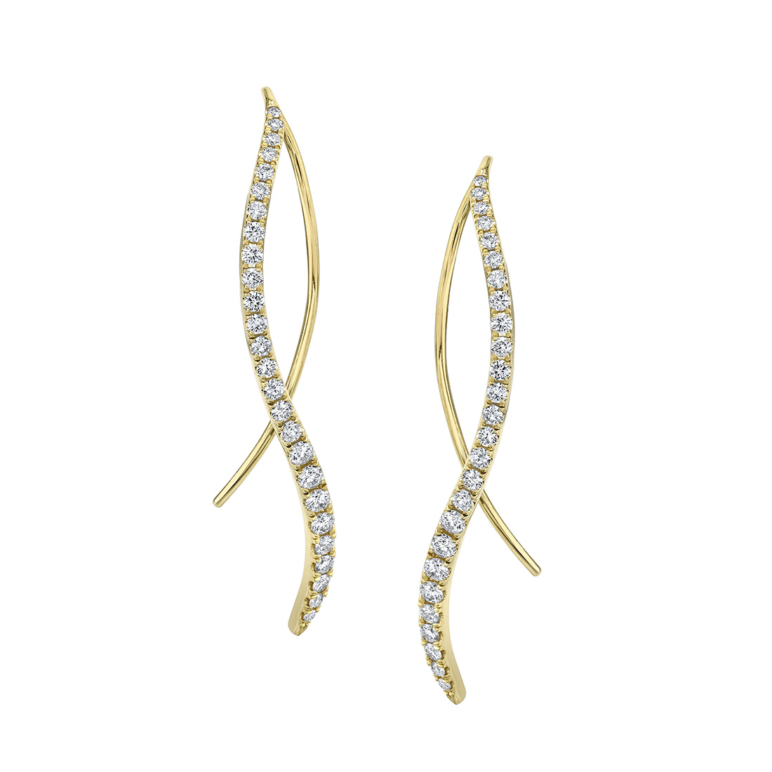 These exquisite diamond fishhook drop earrings feature 0.60 carats of shimmering round brilliant diamonds in an elegant wave shape with a fishhook high polished yellow gold backing that creates an additional layer behind the diamonds for a unique and trendy look!