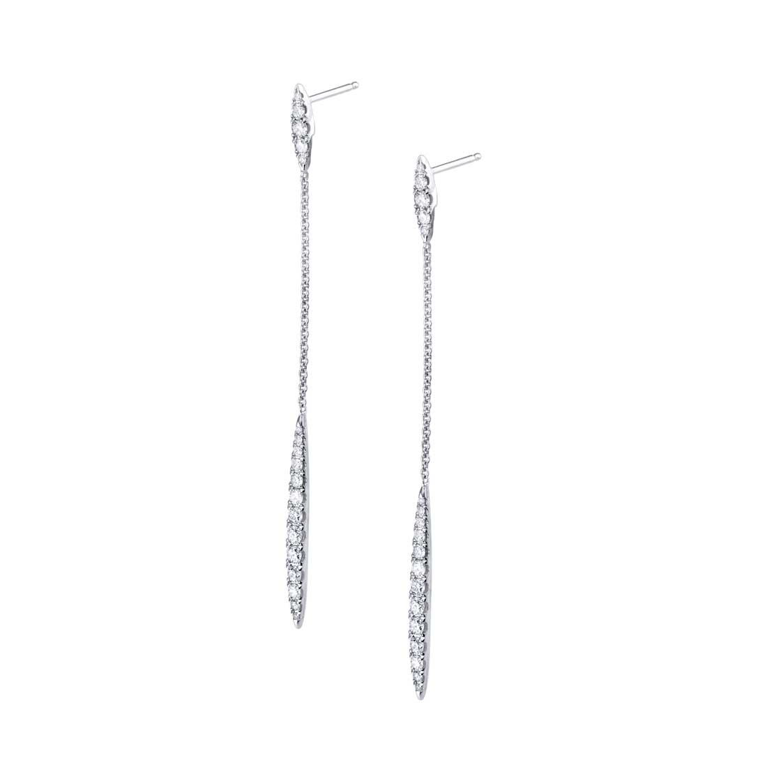 Modern elegance meets timeless sparkle in these 14K white gold diamond drop earrings. Featuring a delicate design that tucks into the ear and suspends a long, graceful drop from a fine chain, they’re adorned with 36 round diamonds totaling 0.61 carats. The perfect mix of subtle drama and refined luxury, these earrings are ideal for both day and evening wear.