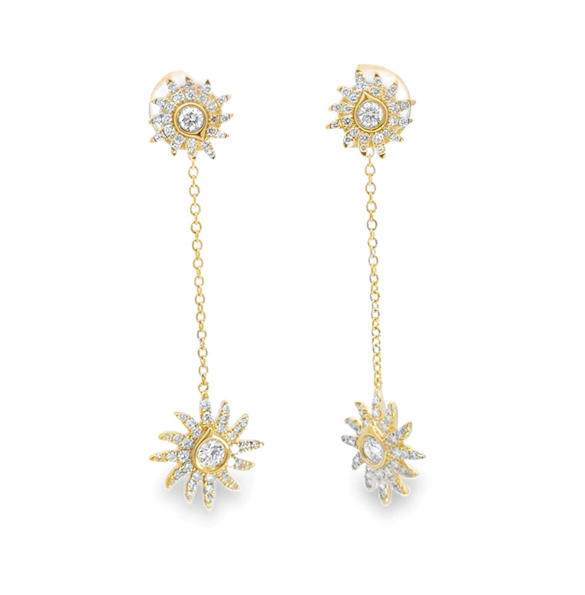 Metal: 14K Yellow Gold Style: Double Sunburst Diamond Drop EarringsStones: Round DiamondsTotal Diamond Count: 122Total Diamond Weight: 0.74 ct-