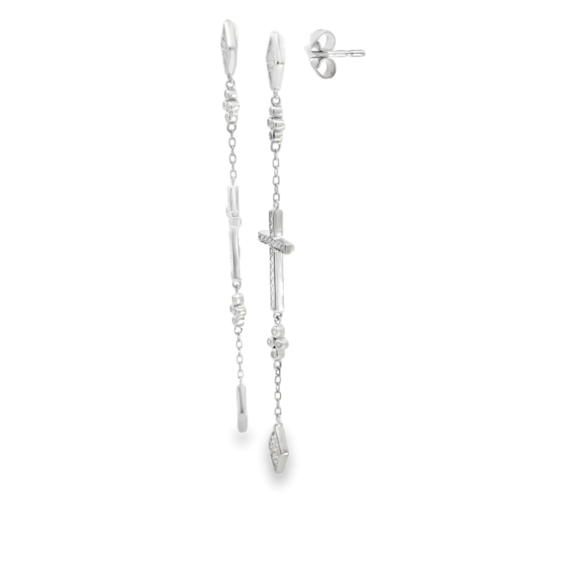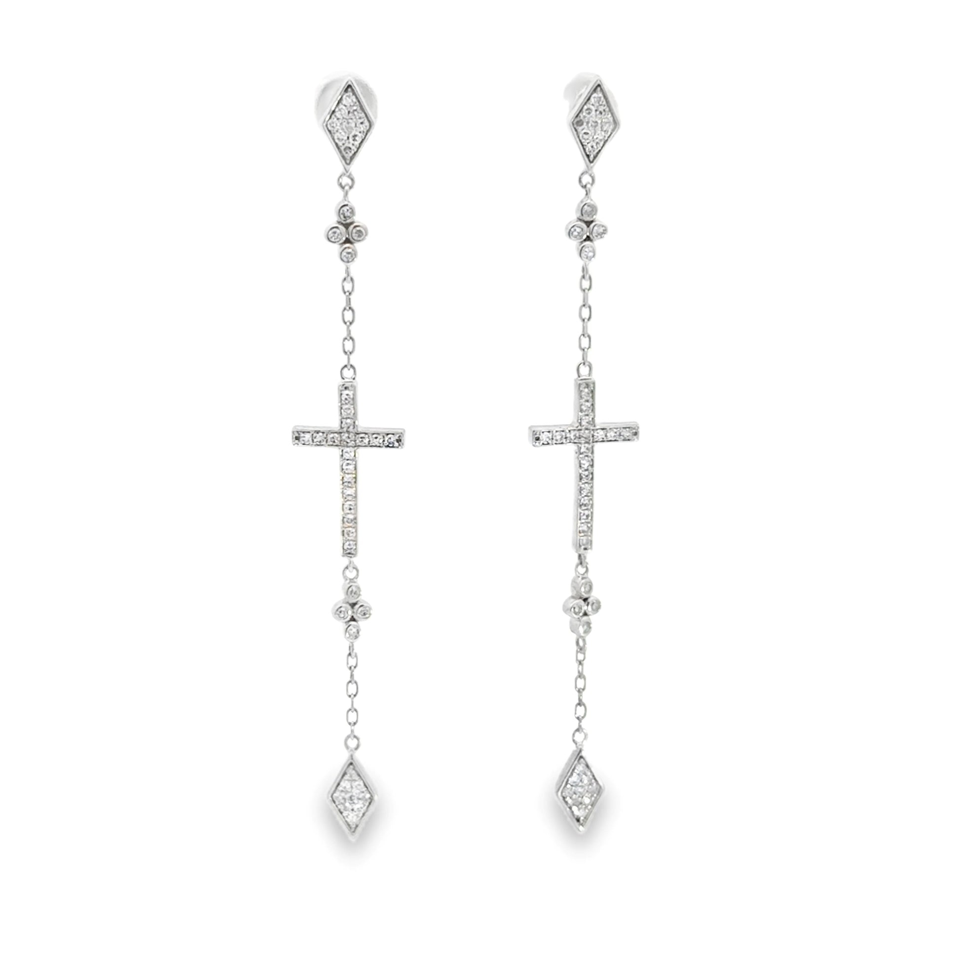 ONE PAIR 14K WHITE GOLD DIAMOND CROSS EARRINGS WITH 88 NATURAL ROUND DIAMONDS WITH A TOTAL CARAT WEIGHT OF 0.28 CARATS COLOR G SI2 INTERNAL CLARITY.