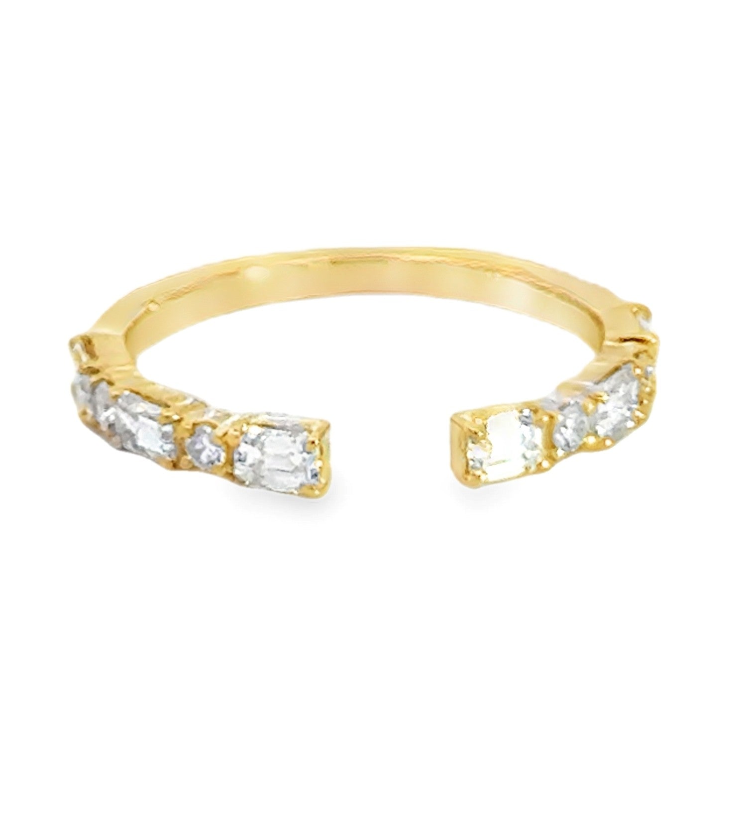 ONE 14K YELLOW GOLD DIAMOND RING WITH 6 EMERALD SHAPED DIAMONDS THAT WEIGH A TOTAL OF 0.60 CARATS AND 4 ROUND DIAMONDS THAT WEIGH A TOTAL OF 0.09 CARATS, ALL DIAMONDS HAVE SI1 INTERNAL CLARITY AND ARE COLOR G.