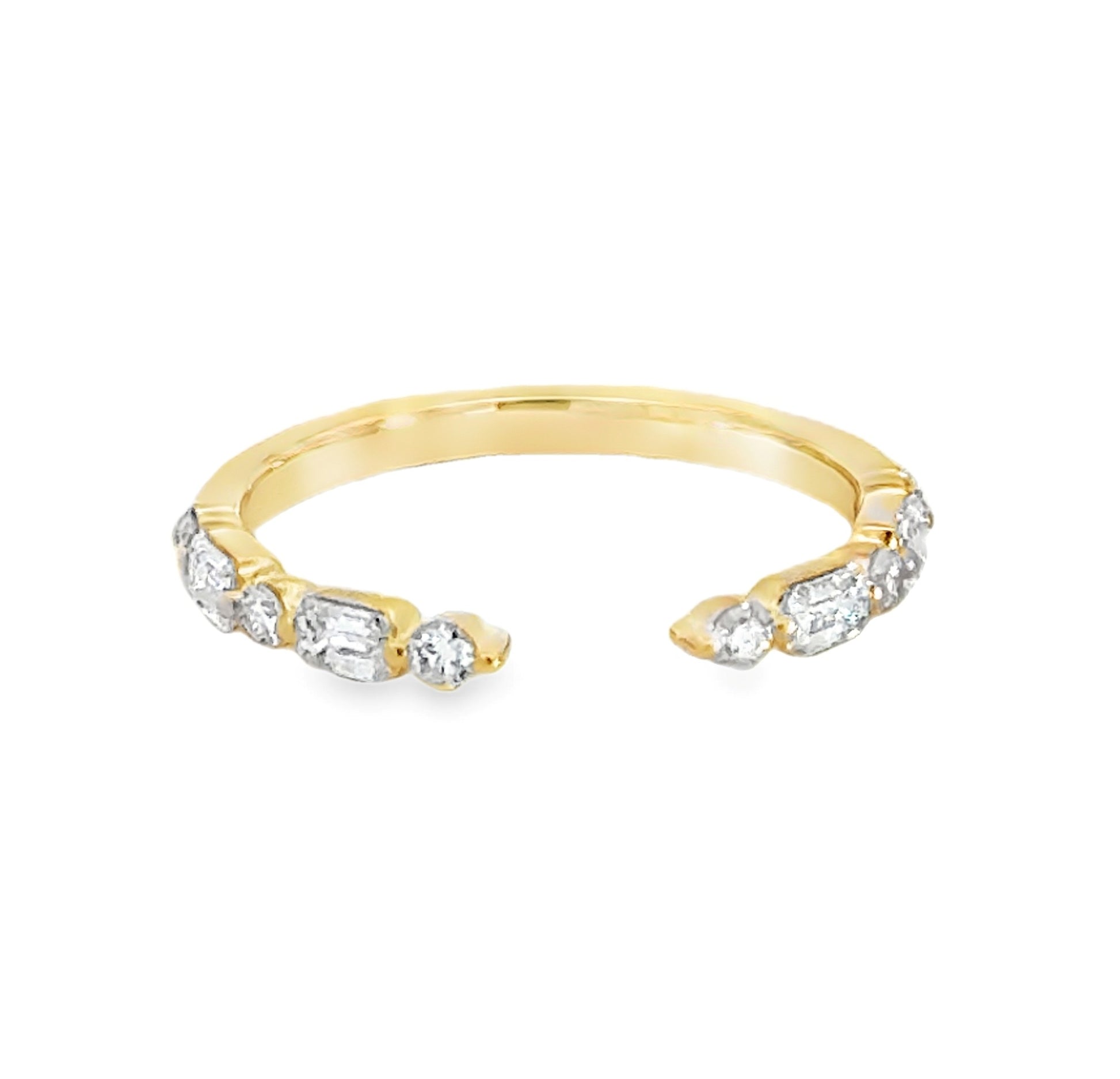 Crafted in luminous 14K yellow gold, this elegant diamond ring features a stunning blend of classic round and sophisticated emerald-shaped diamonds. The design includes six natural round diamonds totaling 0.15 carats and four emerald-shaped diamonds with a total carat weight of 0.32 carats. Each diamond is SI1 in clarity and G in color, delivering a brilliant, near-colorless sparkle. The mix of shapes creates a refined and timeless look, perfect for both everyday wear and special occasions.