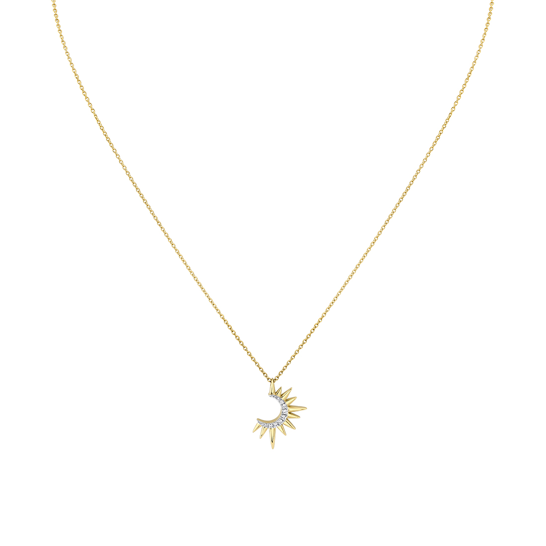 This diamond necklace features an open sun design with high polish yellow gold sun beams alongside a white gold diamond encrusted inner circle with graduated diamonds, totaling 0.1 carats.