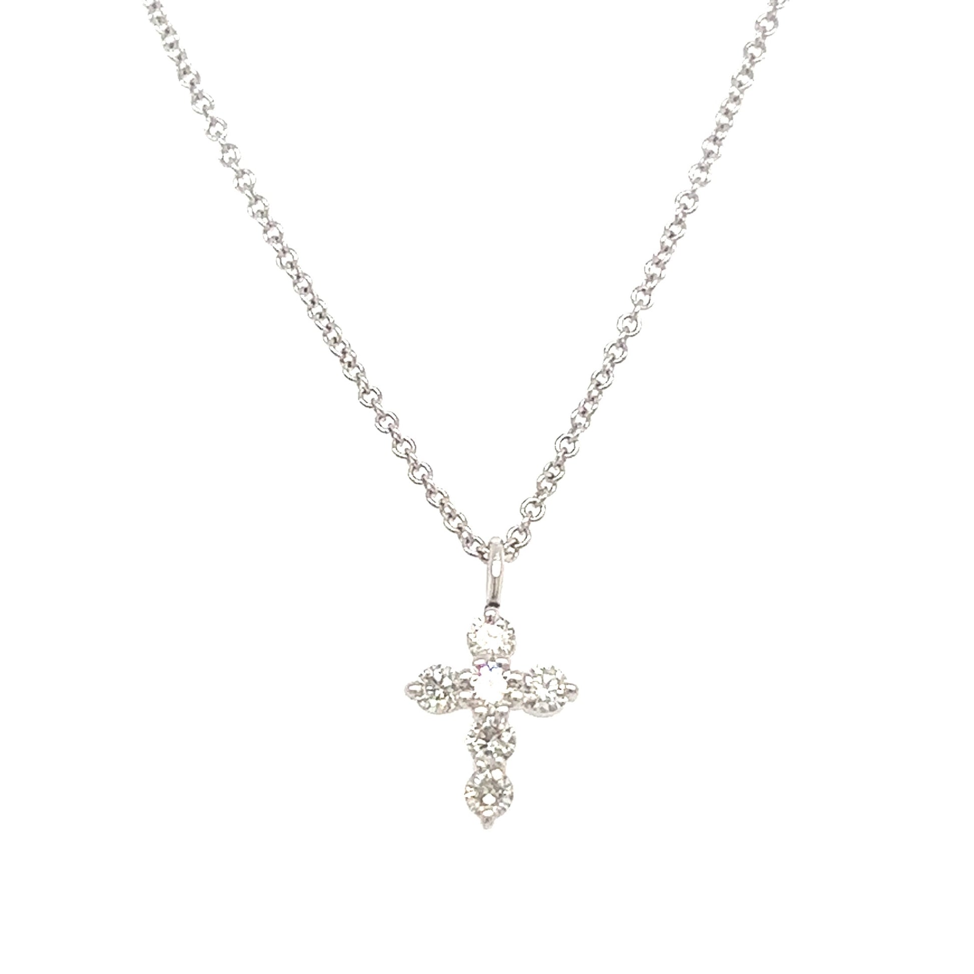 A petite cross emblem makes a wonderful addition to any jewelry collector. This 14K white gold cross features a traditional religious cross shape. Covered with radiant diamonds, this delicate cross shines brilliantly.