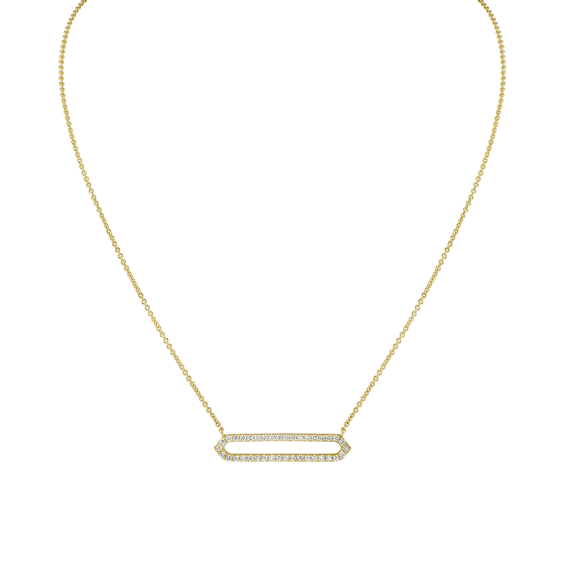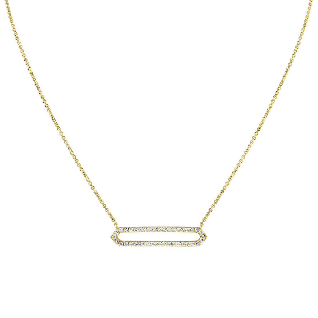 This 14K yellow gold Shell Heritage open bar necklace showcases a sleek, diamond-encrusted bar set with 38 round diamonds totaling 0.50 carats. Accented with signature Shell Tip points at each end, this modern piece blends clean lines with subtle heritage detailing—perfect for layering or wearing solo for a touch of refined sparkle.