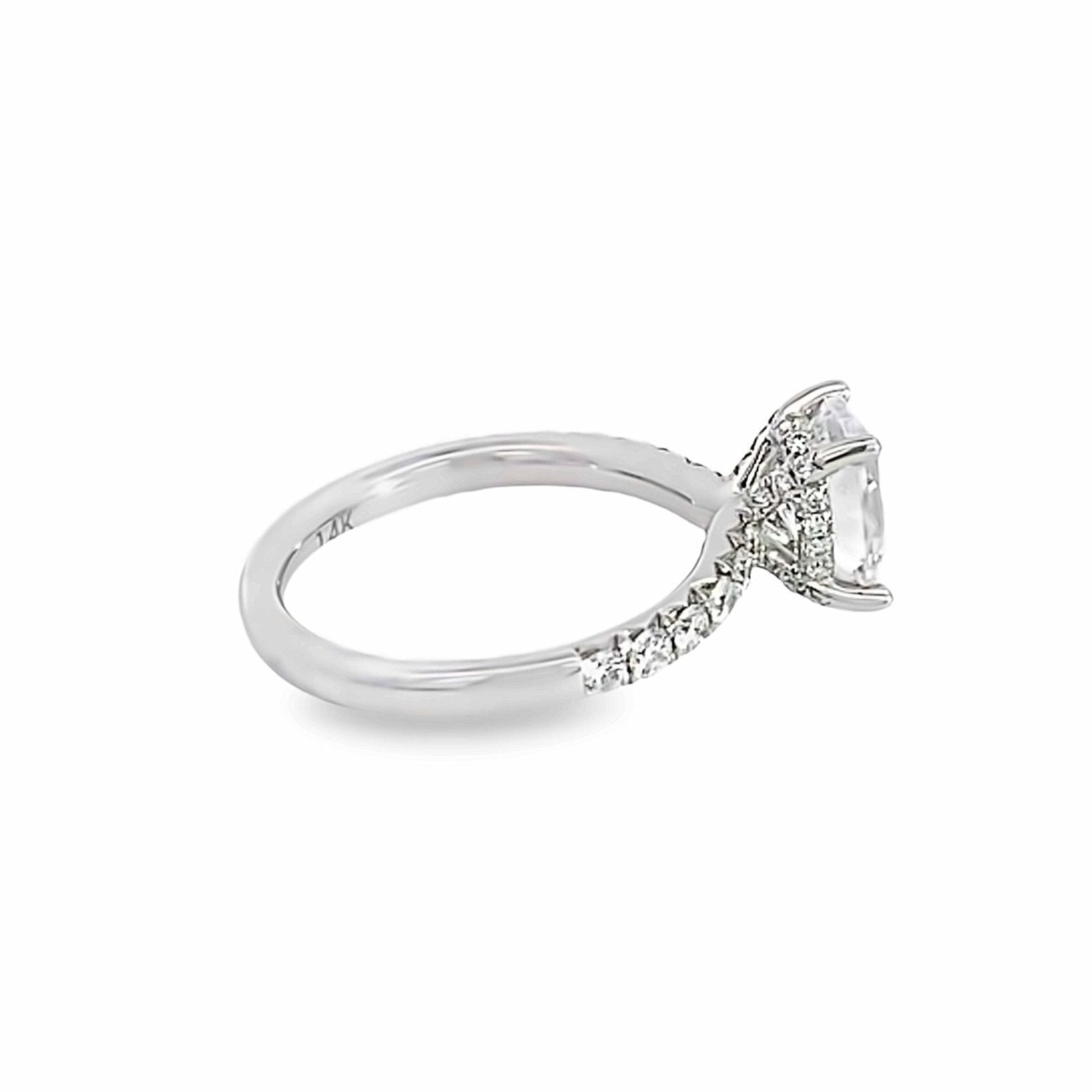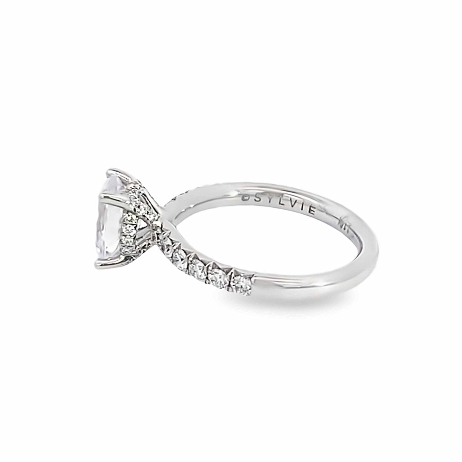 This 14K White Gold Oval Cut Classic Engagement Ring made by Sylvie has 36 round brilliant cut diamonds that weigh 0.54 carats, average SI-2 in internal clarity, and G in color. The center is designed for a 2 carat center Oval cut diamond.