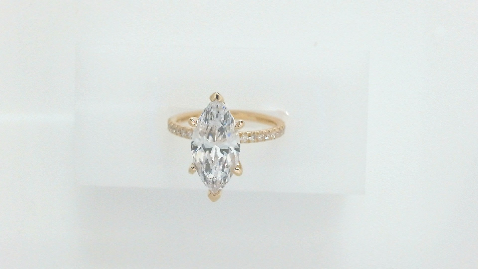14K YELLOW GOLD DIAMOND SHANK MARQUISE CENTER ENGAGEMENT RING. THIS RING HAS 20 ROUND BRILLIANT CUT DIAMONDS THAT HAVE A TOTAL DIAMOND WEIGHT OF 0.20 CT, AND THE DIAMOND AVERAGE G-H/SI2 QUALITY. THIS MOUNTING IS MADE TO FIT A 3 CT, 14X7MM MARQUISE CENTER. CENTER STONE NOT INCLUDED IN PRICE. SERIAL NO S2222443.