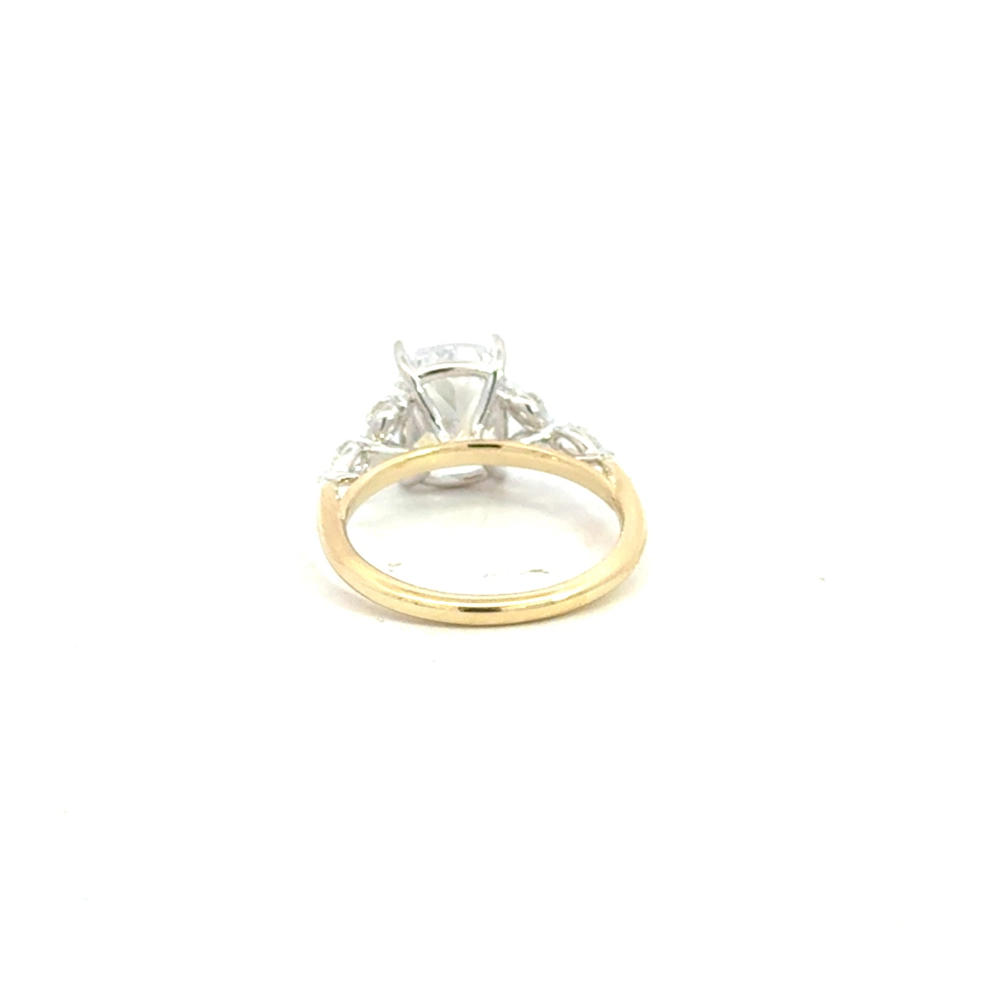 This striking two-tone engagement ring is crafted in 14K white and yellow gold and features a 3.00 carat cushion-shaped CZ center stone used as a placeholder. Flanking the center stone are four natural marquise-shaped diamonds and two natural pear-shaped diamonds, creating a balanced and elegant design. The accent diamonds have an average internal clarity of VS2 and a bright G color grade, with a total diamond weight of 0.48 carats, making this ring a timeless and sophisticated symbol of love.
