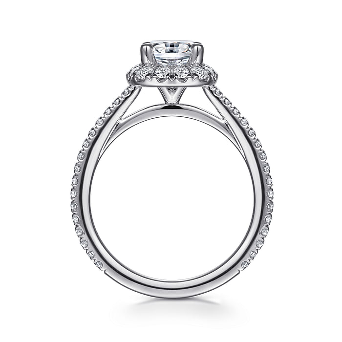 The ring 14K white gold engagement ring from Gabriel Bridal's Collection named "Madelie" This timeless and elegant solitaire-style ring symbolizes love and commitment. Featuring 48 round brilliant diamonds that weigh 0.50 total carats, this halo style engagement ring is beautiful boasting SI2 in internal clarity and G in color.