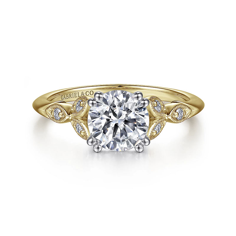 If she’s dreaming of a ‘fairytale’ wedding, she’ll love this round engagement ring with Victorian style detailing. A trio of delicate diamond and milgrain petals on either shoulder embrace the center stone set in 14K white gold and add 0.07cts of sparkle. Finished with a sculpted shank of polished 14K yellow gold, this setting radiates romance.