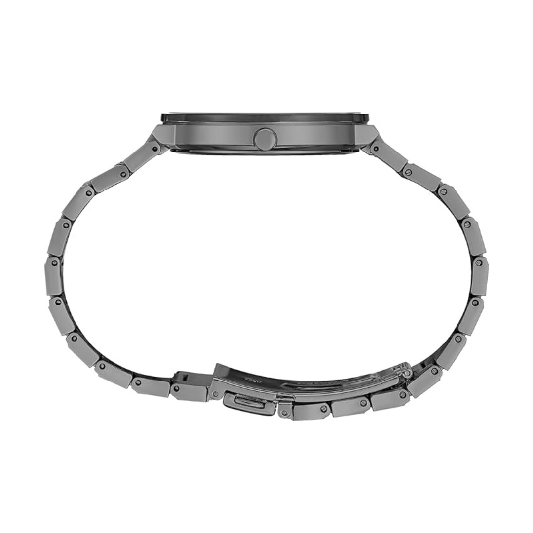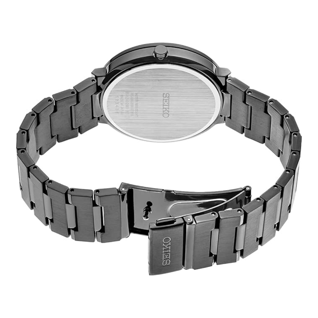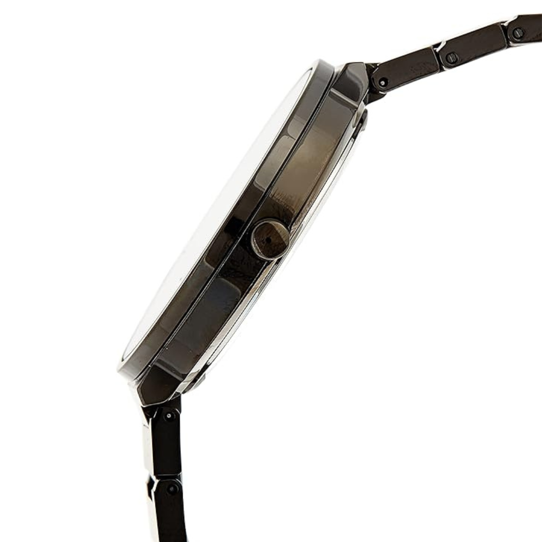 From the Essentials Collection. Offering classic dress/sport design, the Essentials Collection provides the ideal solution for everyday wear. With contemporary minimalism, this sharp and streamlined watch offers a sleek black sunray dial with date calendar, and a slim and comfortable stainless steel case and bracelet in dramatic black ion finish. 3 bar, 30M Water Resistant.