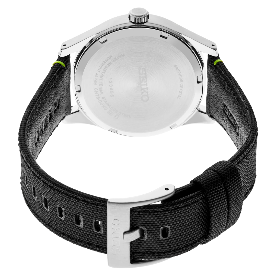 From the Essentials Collection. Designed to evoke the cool thrill of driving by night, this smooth watch offers a slim profile for sleek sport or everyday wear. The rich black dial, framed by a black metallic ring, adds a streetwear edge with its y-shaped shoe-sole pressed pattern. With big date calendar, bright green second hand, and LumiBrite hands and markers, this polished timepiece includes a stainless steel case with black ion finish and a rugged nylon/leather strap. 10 bar, 100M Water Resistant