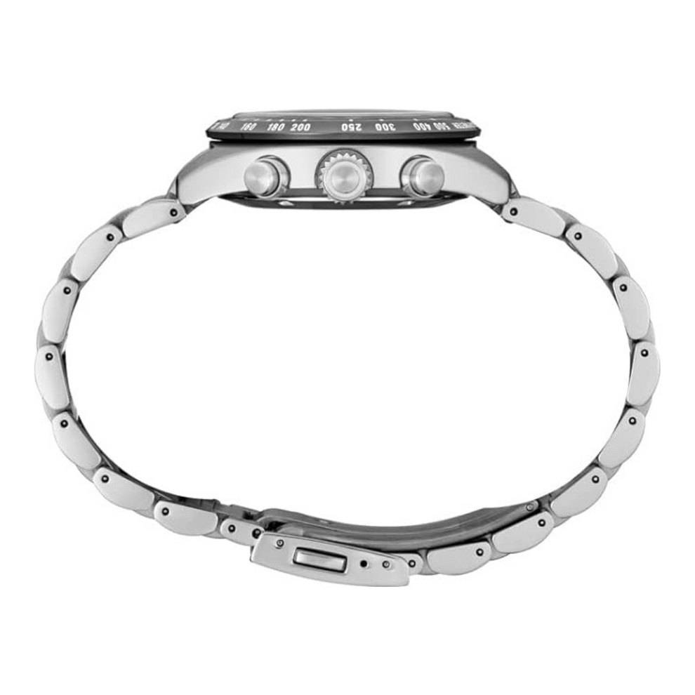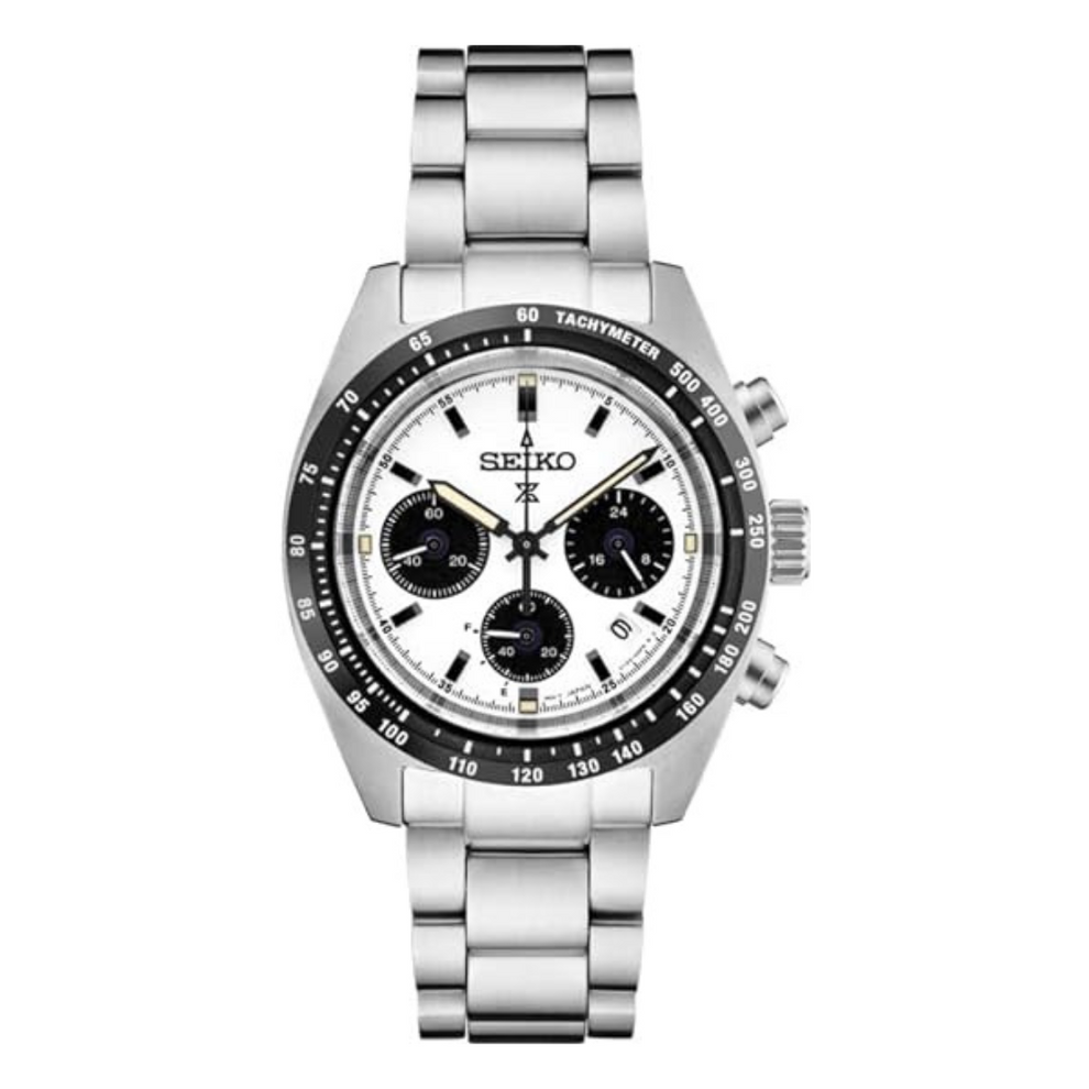 Prospex Speedtimer Solar Chronograph. Designed for those who treat life as the ultimate adventure, Seiko Prospex keeps moving forward, meeting every challenge with technological excellence and winning design. Combining precision timing with wearability and the energy efficiency of solar power, this exceptional watch, inspired by Seiko’s first precision chronographs, developed for international sporting competitions in 1964, provides chronograph measurement of up to 60 minutes of elapsed time in 1/5-second increments and includes a split time function. The solar cell, powered by any light source, with no battery change required, offers a 6-month power reserve when fully charged. Framed by a black tachymeter bezel, the white dial, with distinctive sand-blasted texture, features three black subdials, including a 24-hour indicator, as well as a date calendar and beige LumiBrite hands and markers. In stainless steel, with curved anti-reflective sapphire crystal, this rugged timepiece also offers the security of a screwdown caseback and tri-fold push button release clasp. 10 bar, 100M Water Resistant