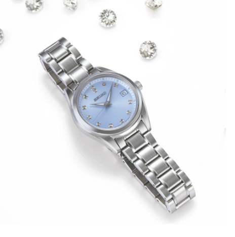 From the Diamond Collection. With elegant simplicity, this versatile design, perfect for dress or everyday wear, features a shimmering blue sunray finish dial set with 12 diamonds. Crafted of stainless steel, with a sleek, perfectly proportioned case and bracelet for a superior fit on the wrist, this graceful watch includes a scratch-resistant sapphire crystal, date calendar, and LumiBrite hands and markers. 10 bar, 100M Water Resistant