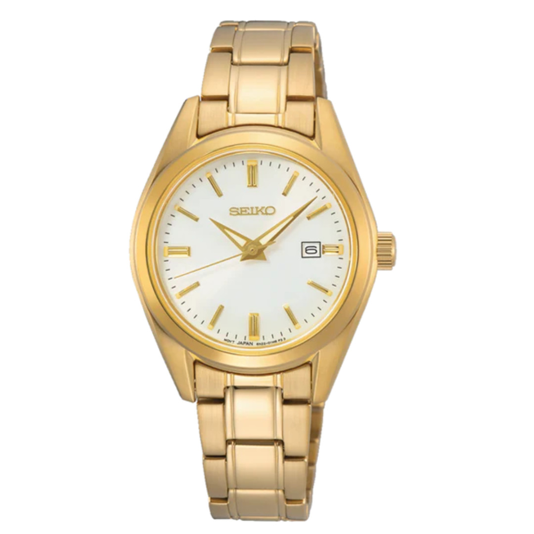This Seiko timepiece, featuring the 6N22 caliber, is a testament to precision and enduring style. With a remarkable ±15 seconds per month accuracy and a battery life of approximately 3 years, it seamlessly blends reliability with elegance. The stainless steel case, boasting a thickness of 8.3mm and a diameter of 29.8mm, is adorned with a scratch-resistant sapphire crystal and Lumibrite on both hands and indices for enhanced visibility in any light. With a water resistance of 10 bar, a screw case back, and the luxurious touch of gold plating, this Seiko watch is a harmonious fusion of functionality and timeless allure, weighing in at a graceful 60.0 grams.