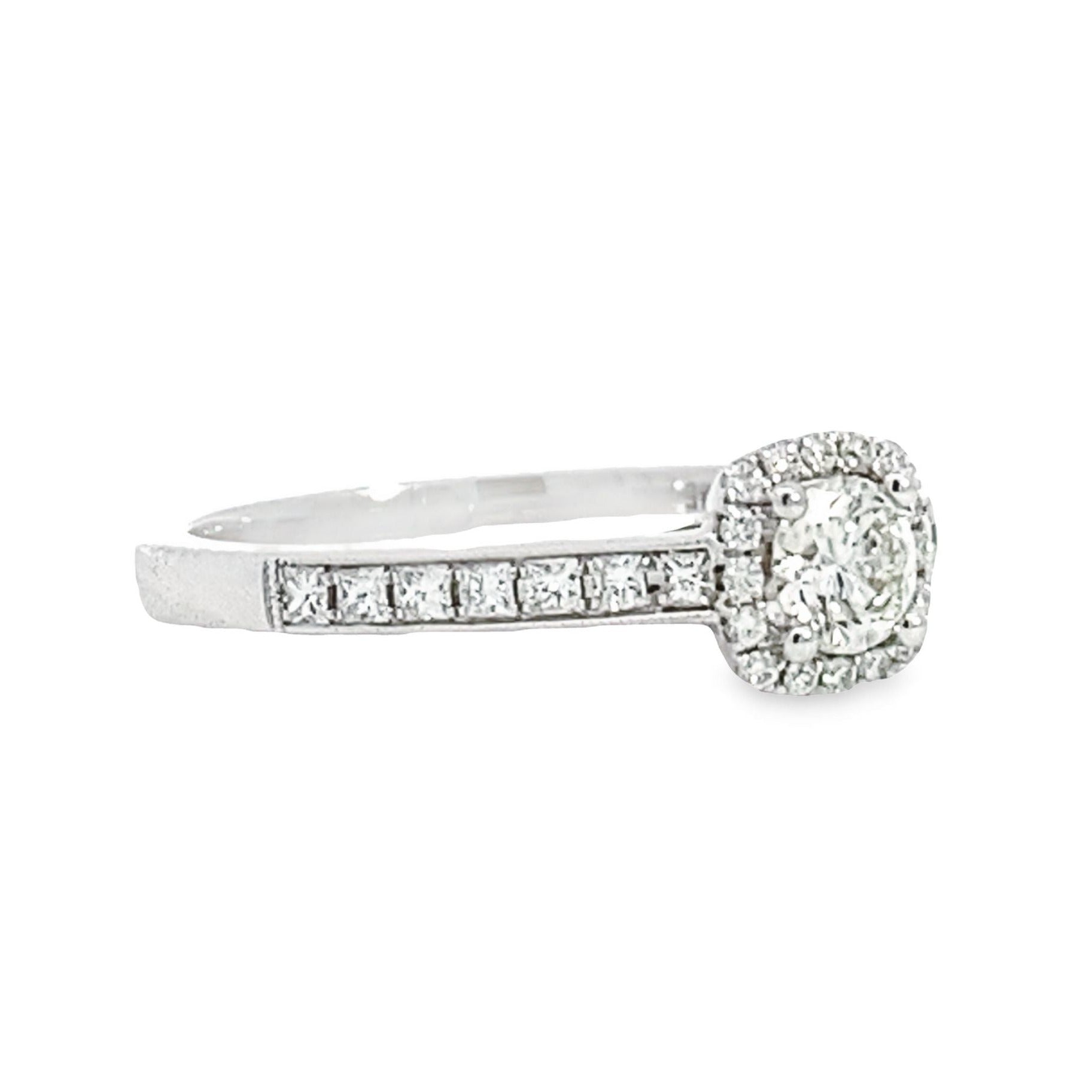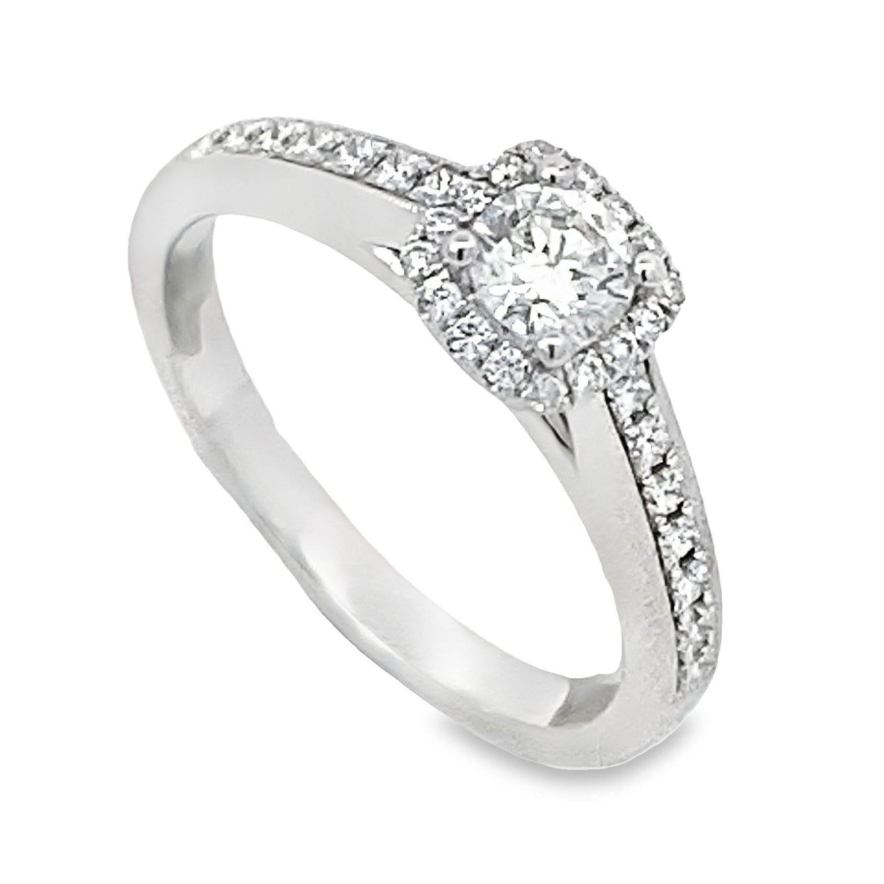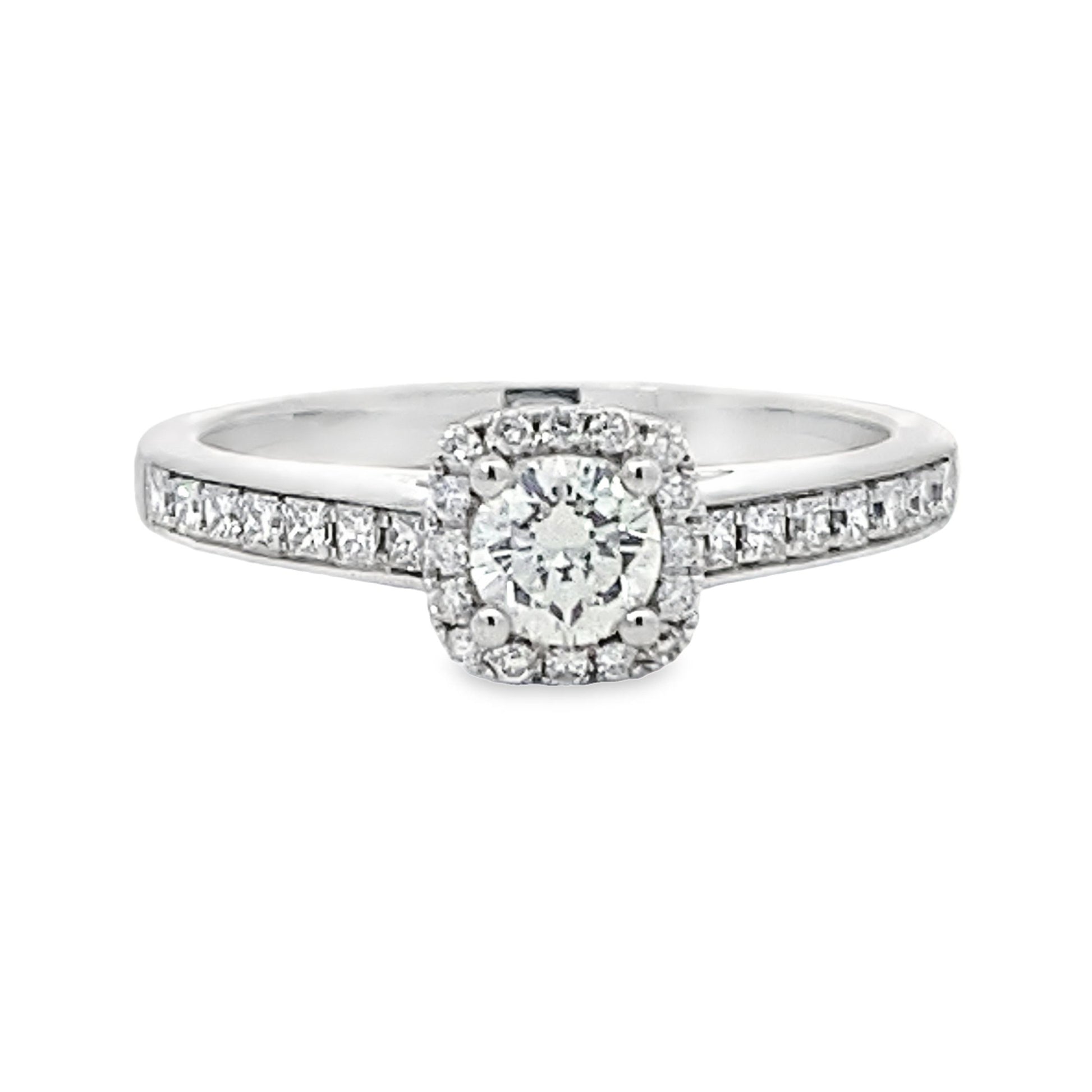 This 14K White Gold Diamond Engagement Ring features 28 round diamonds that weigh 0.28 carats total weight, They are SI-2 internal clarity and G in color. The round center diamond weighs 0.30 carats, is SI-2 internal clarity, and H in color.